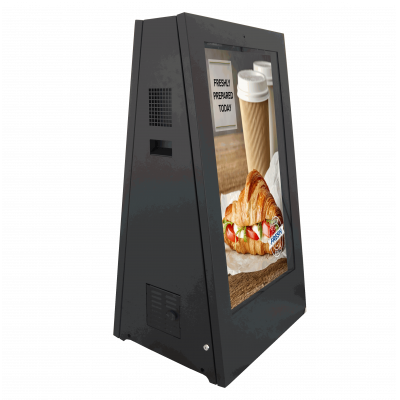 Det dobbeltsidede digitale A-kort bruger to 43-tommer skærme til at tiltrække kunder fra begge retninger. Engager forbipasserende og øg salget på dine promoverede varer.