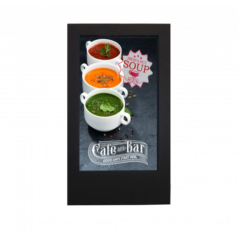 Classement IP56 | Annoncez de manière fiable dans les endroits extérieurs et par temps pluvieux. L'écran est protégé contre la pénétration d'eau et de poussière. |