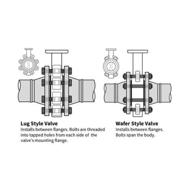 तितली वेफर वाल्व का उपयोग केवल flanges के बीच किया जा सकता है, न कि लाइन के अंत में, जहां केवल एक निकला हुआ किनारा है।