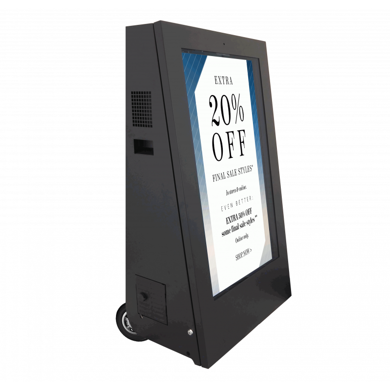 Uno schermo da 1.000 NITS mantiene le tue promozioni leggibili alla luce del sole. La batteria offre fino a 10 ore di pubblicità e un grado di protezione IP56 protegge il telaio A da acqua e polvere.