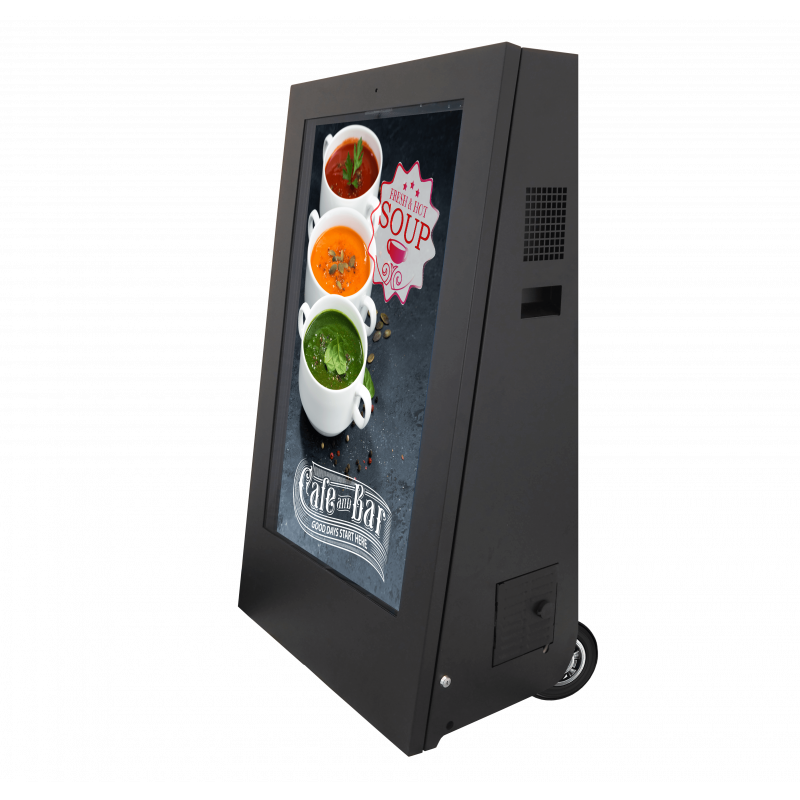 片面Aフレームは理想的な舗装デジタルサイネージソリューションです。 43インチのスクリーンは顧客の注意を引き付け、彼らが店に来るように促します。バッテリー駆動のサンドイッチボードにはブレーキが効いています。コードフリー設計なので、歩行者用区域に安全に置いておくことができます。