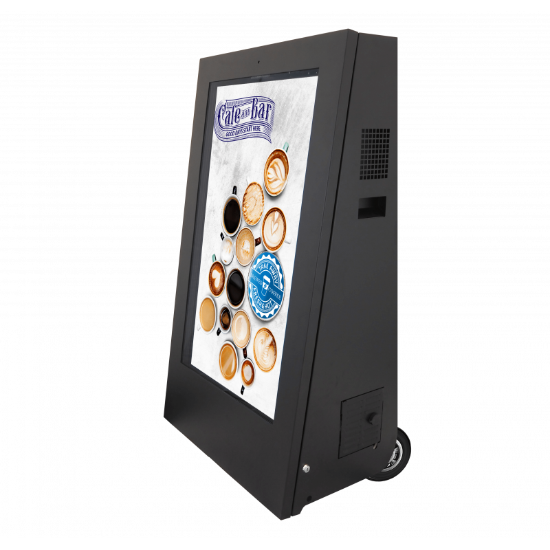 Цифровая сэндвич-доска делает розничную рекламу удобной и эффективной. Легко переместите дисплей в наиболее заметное место, чтобы привлечь клиентов. Экран 2500 NITS гарантирует, что ваши рекламные материалы будут отлично смотреться при ярком солнечном свете и на открытом воздухе.