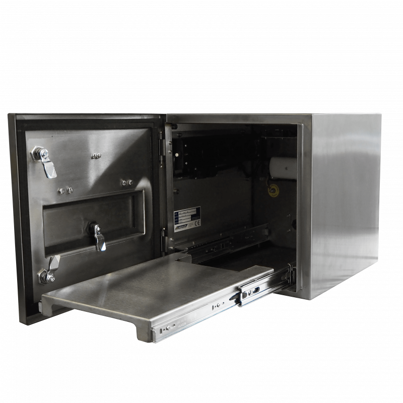 I renrumsskrivarhöljet kan du installera en skrivare i alla våta, sterila eller frätande miljöer. Operatörer sparar tid genom att skriva ut direkt på affärsgolvet istället för att gå till ett kontor. En främre åtkomstflik ger ett snabbt arbetsflöde genom att ge enkel åtkomst till utskrifter samtidigt som skrivaren skyddas.